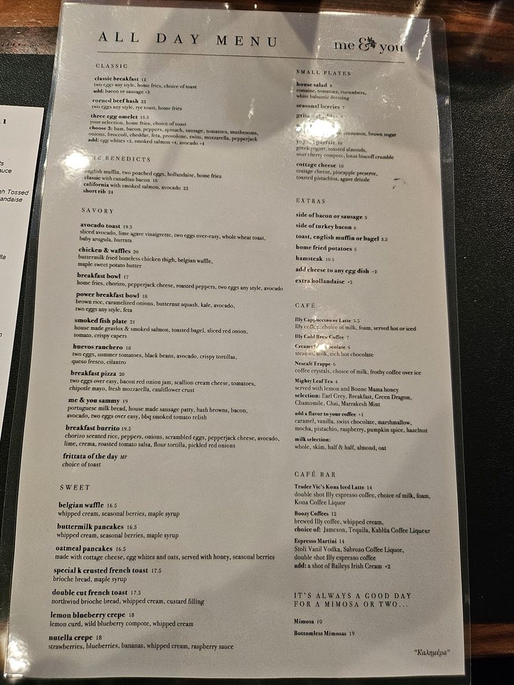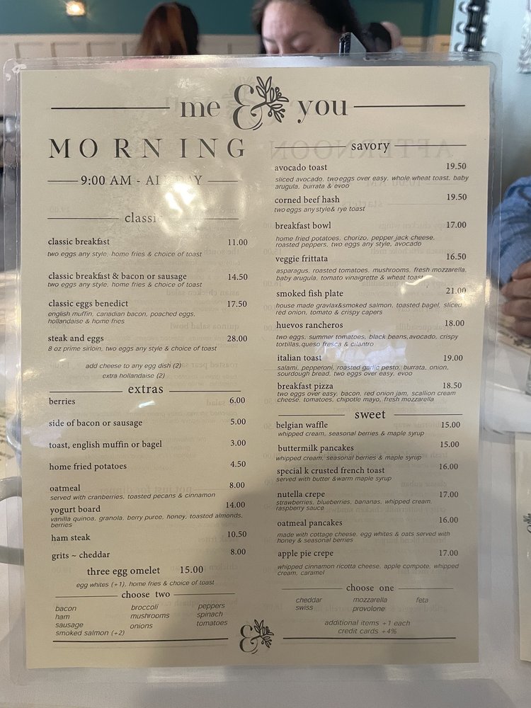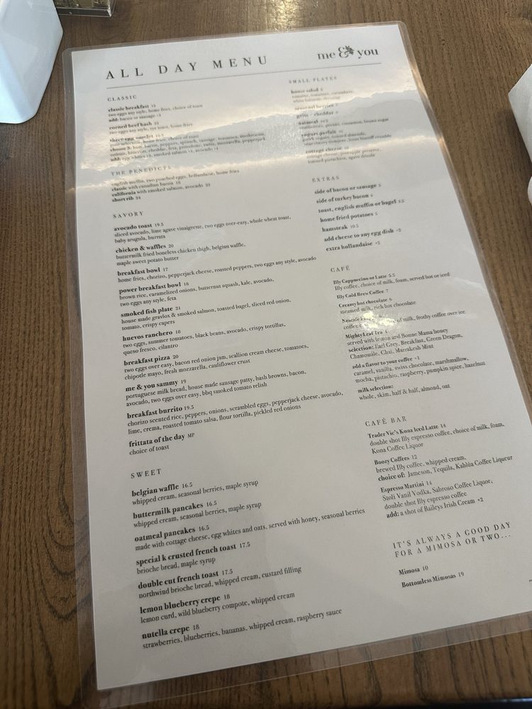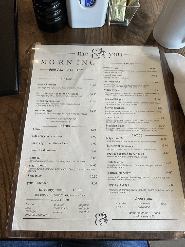 Introducing the menu at Me & You, located at 326 Broadway in Bethpage, NY, is an experience that transcends ordinary breakfast and brunch offerings. This American eatery showcases an impressive range of dishes, from savory breakfast staples to hearty lunch options. Picture yourself delighting in the Avocado Toast with perfectly cooked eggs, or savoring the bold flavors of the Chorizo Frittata.