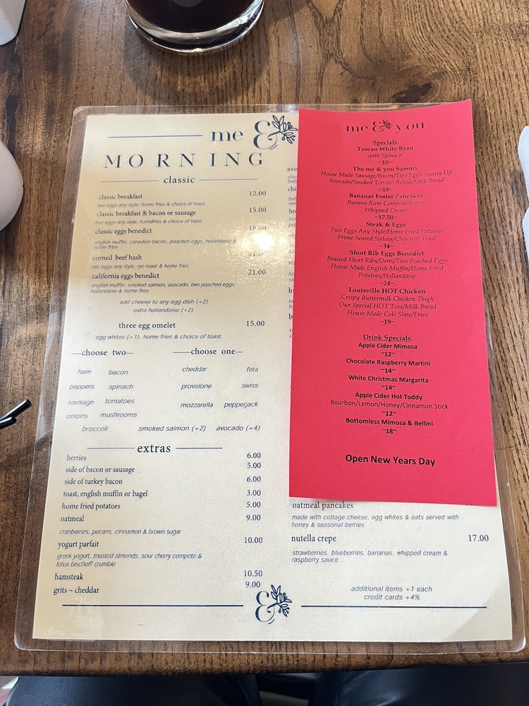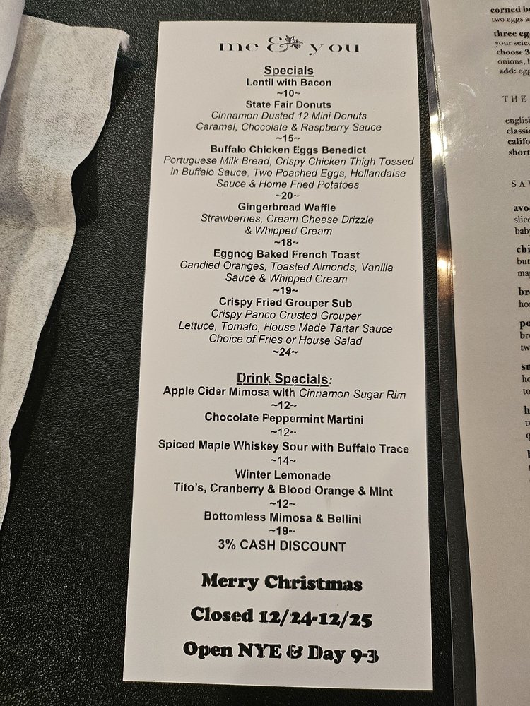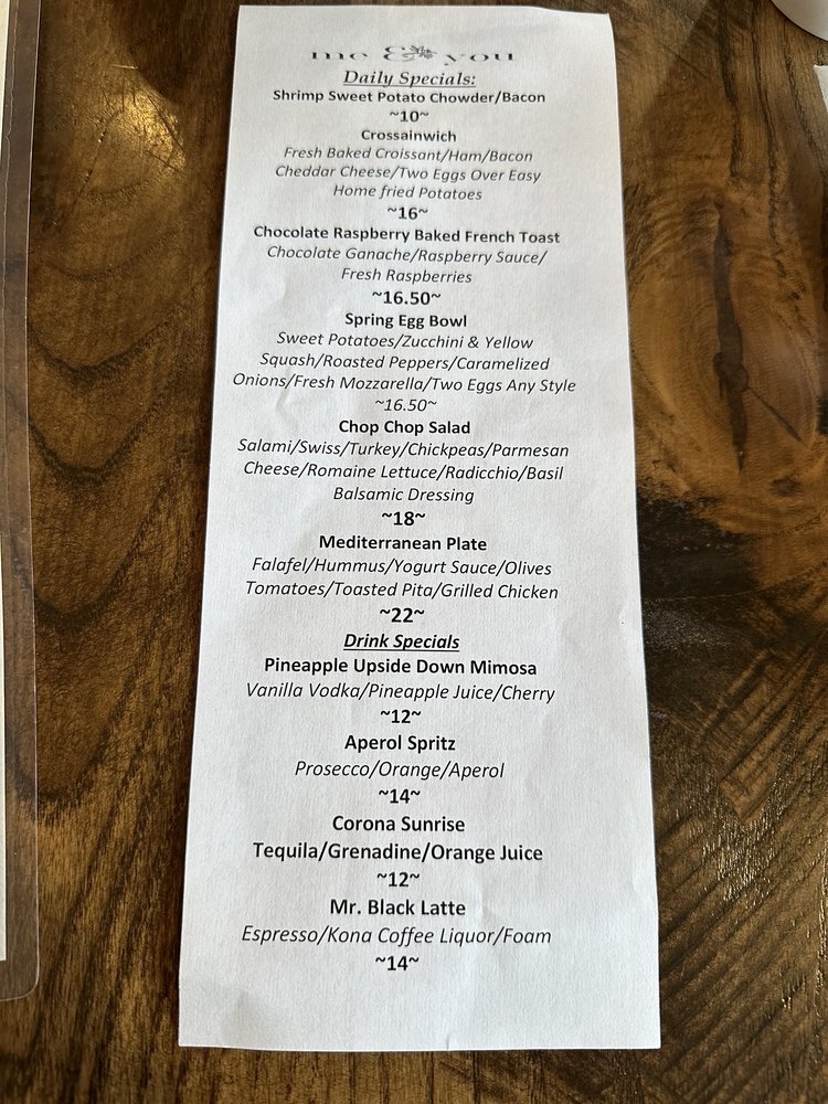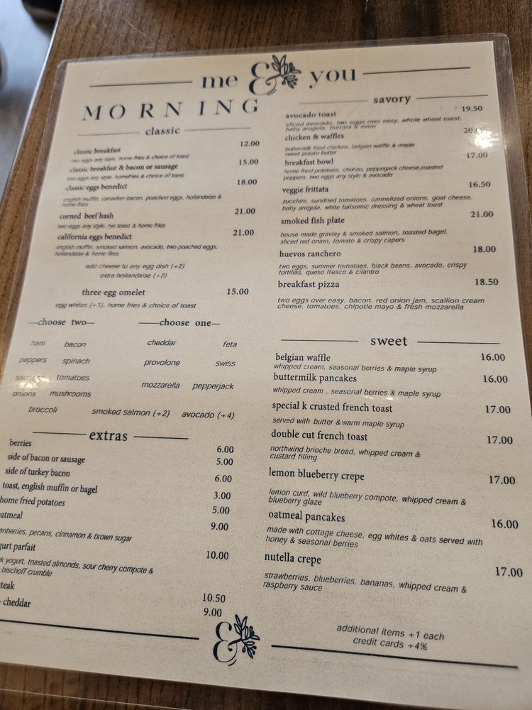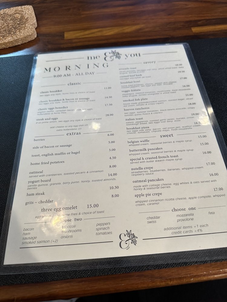 Introducing the menu at Me & You, located at 326 Broadway in Bethpage, NY, is an experience that transcends ordinary breakfast and brunch offerings. This American eatery showcases an impressive range of dishes, from savory breakfast staples to hearty lunch options. Picture yourself delighting in the Avocado Toast with perfectly cooked eggs, or savoring the bold flavors of the Chorizo Frittata.